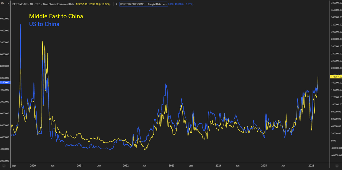 经纪商 克拉克森 (Clarksons)在一份报告中指出, VLCC现货运价的变动,并不需要实际运输的原油数量减少 。报告写道:“只要市场对风险的感知上升,运价就可能迅速被重新定价——包括战争风险保费上调、船东要求因靠港该地区获得额外补偿,以及租船方为降低航期不确定性而提前、拉长订舱周期。”