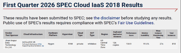 近日,国际权威组织 SPEC 公布 SPEC Cloud IaaS 2018 测试结果。基于 海光 C86 架构处理器的服务器在浪潮云海 InCloud OS 环境中取得国产厂商公开实测最高成绩。