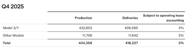 1月2日, 特斯拉 官方发布的数据显示,公司2025年第四季度共生产汽车43.44万辆,同比下降5.46%;交付量为41.82万辆,低于机构预测的平均值42.29万辆,同比下降15.61%。 特斯拉 的能源产品持续增长,其第四季度部署了14.2GWh的储能产品,再创历史新高。
