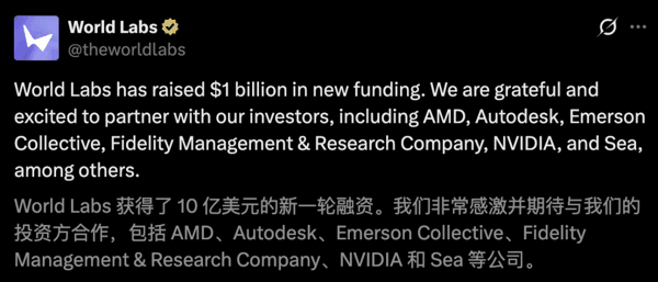 就在刚刚,李飞飞「明星初创」World Labs 官宣:成功斩获高达 10 亿美元的全新一轮融资。