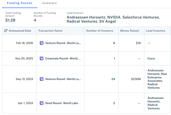 据 Crunchbase 统计,自成立以来,World Labs 已完成 4 轮融资。
