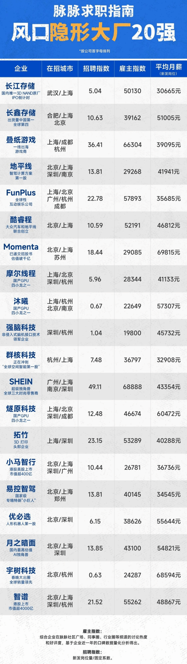 4月9日,职场社区平台脉脉发布80家“隐形大厂”名单,涵盖 智谱 、SHEIN、地平线、Momenta等企业,覆盖AI、智能驾驶、 机器人 、芯片等热门赛道。名单显示,高薪岗位正加速从传统大厂向一批高速发展的“隐形大厂”扩展。