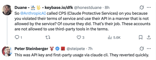 「是因为你违反了他们的服务条款、以不被允许的方式使用 API,才对你动用了 CPS(Claude Protective Services)?那当然会这么做,这就是他们的职责。按照条款,这类账户本来就不允许通过第三方工具来使用服务。」