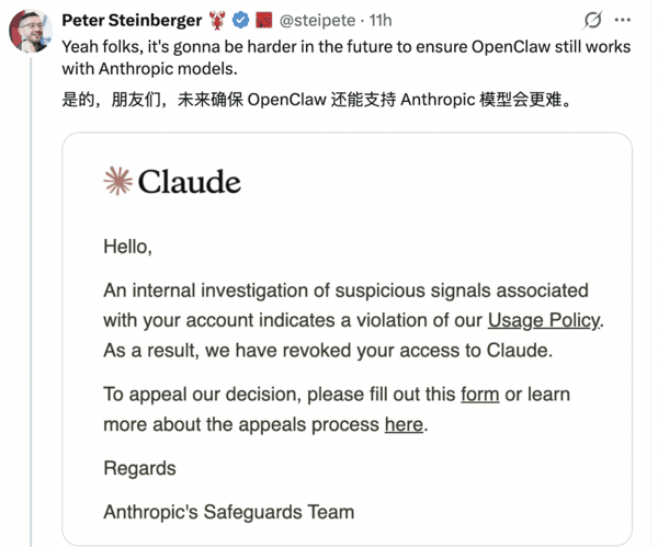 今天一大早,OpenClaw 创始人 Peter Steinberger 就在 X 上发文: 「是的,各位,未来要确保 OpenClaw 继续与 Anthropic 模型兼容将会更加困难。」