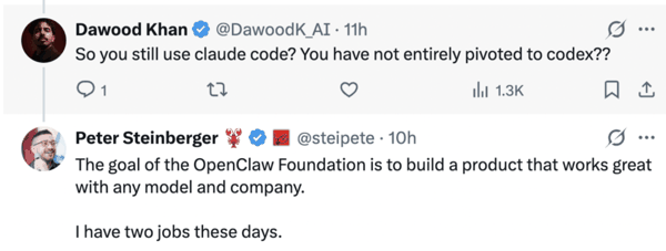 「你需要把两件事区分开来:我在 OpenClaw Foundation 的工作,是希望让 OpenClaw 能够很好地兼容所有的模型 / 提供商;而我在 OpenAI 的工作,则是帮助他们制定未来的产品战略。」
