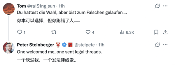 Peter Steinberger 也是毫不犹豫地反击: 「他们一个欢迎我,一个发法律函……」