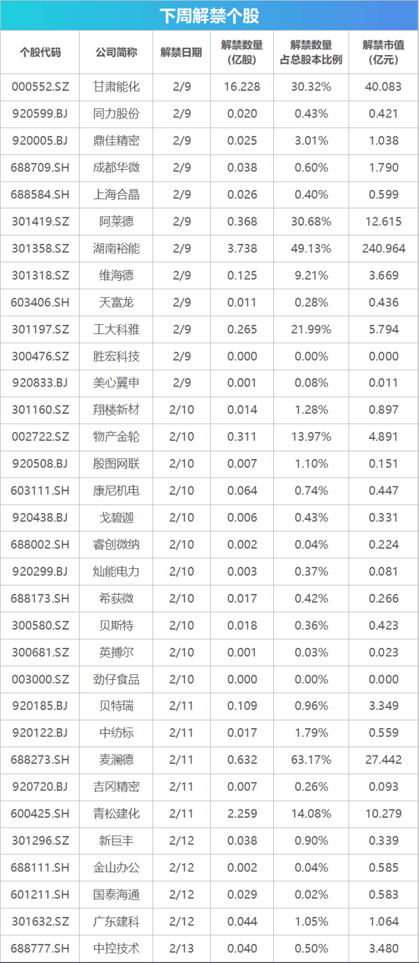 从解禁市值来看,2月9日是解禁高峰期,12家公司解禁市值合计307.41亿元,占下周解禁规模的84.71%。按2月6日收盘价计算,解禁市值居前三位的是: 湖南裕能 (240.96亿元)、 甘肃能化 (40.08亿元)、 麦澜德 (27.44亿元)。从个股的解禁量看,解禁股数居前三位的是: 甘肃能化 (16.23亿股)、 湖南裕能 (3.74亿股)、 青松建化 (2.26亿股)。
