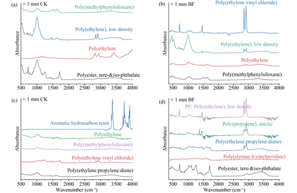 图1 基于FTIR的土壤中微塑料 (MP) 类型。(a) CK样品中大于1 mm 的MP类型;(b) BF样品中大于 1 mm的MP类型;(c) CK样品中小于1 mm 的MP类型;(d) BF样品中小于1 mm 的MP类型。