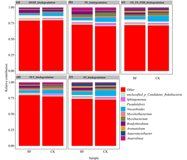 粒径和形态变化反映了BF的微生物降解过程。与纯聚合物不同,生物降解地膜需要土壤微生物在田间条件下降解,微生物联合体和酶途径对MP降解至关重要。本研究鉴定出的前五种聚合物类型为DEHP、PE、PE-PS-PHB、PET和PS,这种差异归因于BF的影响。共鉴定出超过26个与这些聚合物降解相关的DNA序列。在功能水平上,各属的贡献在不同聚合物类型间相似,但具体比例存在差异:例如在PE-PS-PHB降解中,Pseudomonas在BF中贡献约5%,而Nocardioides在CK中贡献约9% (图5)。