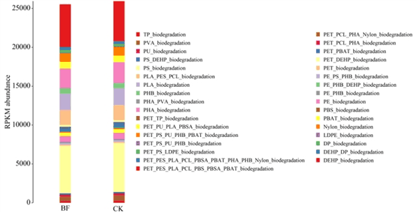 BF和CK中排名前五的MP降解功能组均为PS降解、DEHP降解、PE降解、PE-PS-PHB降解和PET降解(图4)。在基因水平上,DEHP降解中的 pcaC、bcrC、ligI ,PE降解中的alkR,PE-PS-PHB降解中的paaF、HSD17B10,以及PET降解中的ALDH基因丰度在BF和CK间存在显著差异。