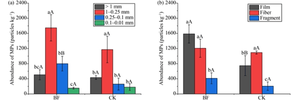 图2 BF和CK情景下土壤中微塑料 (MP) 丰度。(a) 不同粒径MP的丰度;(b) 不同形态MP的丰度。