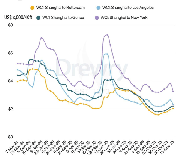 从具体数据表现来看,上海至欧洲航线的WCI指数趋势与上海至美国航线相反。截止11月13日,上海至热那亚航线现货价上涨4%至每40'GP2193美元,上海至鹿特丹航线上涨3%至每40'GP2028美元。