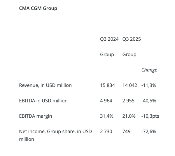 达飞海运的业绩损失更为惨重。据公开数据,第三季度净利润大幅降至7.49亿美元,同比减少72.6%。公司指出,尽管海运板块运输量小幅增长至 617 万 TEU,同比上升2.3%,但平均运价仍显著走低,海运部门收入降至 89.64 亿美元,同比减少17.4%。