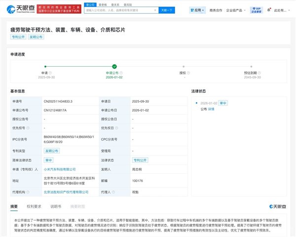 快科技1月5日消息,天眼查知识产权信息显示, 1月2日,小米汽车科技有限公司申请的“疲劳驾驶干预方法、装置、车辆、设备、介质和芯片”专利公布。