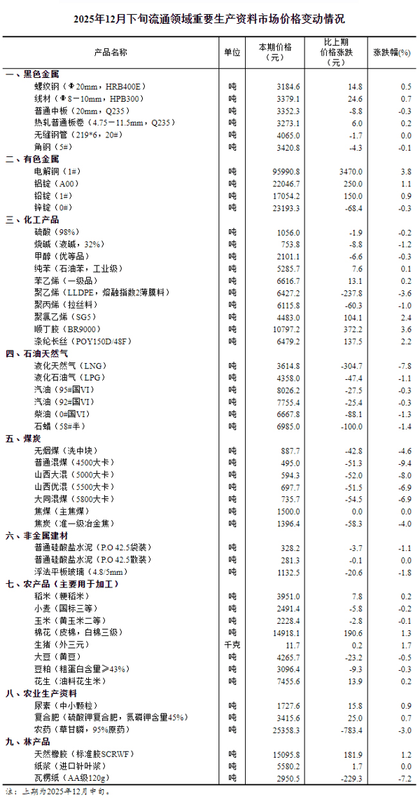 中新网 1月4日电 据国家统计局网站消息,国家统计局1月4日发布2025年12月下旬流通领域重要生产资料市场价格变动情况。据对全国流通领域9大类50种重要生产资料市场价格的监测显示,2025年12月下旬与12月中旬相比,18种产品价格上涨,28种下降,4种持平。