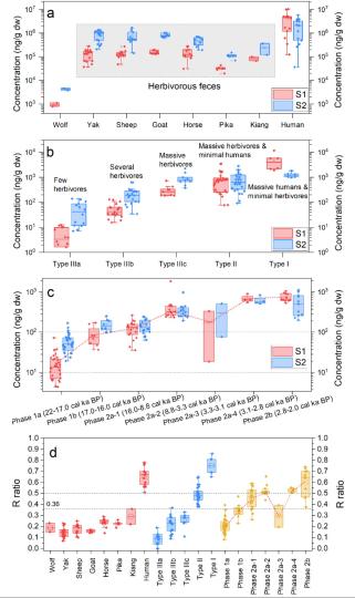 青藏高原上粪便甾醇在人与不同动物粪便、湖泊表层沉积物和昂仁金错湖芯中的变化。中国科学院青藏高原研究所供图