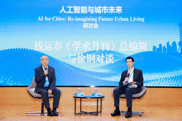 在新锐青年论坛环节,《学术月刊》总编辑钱运春与上海市人工智能社会治理协同创新中心秘书长、同济大学法学院副院长徐钢围绕“人工智能与城市未来”这一主题,从学术研究、经济发展、社会治理和青年学者发展等角度展开深入交流。