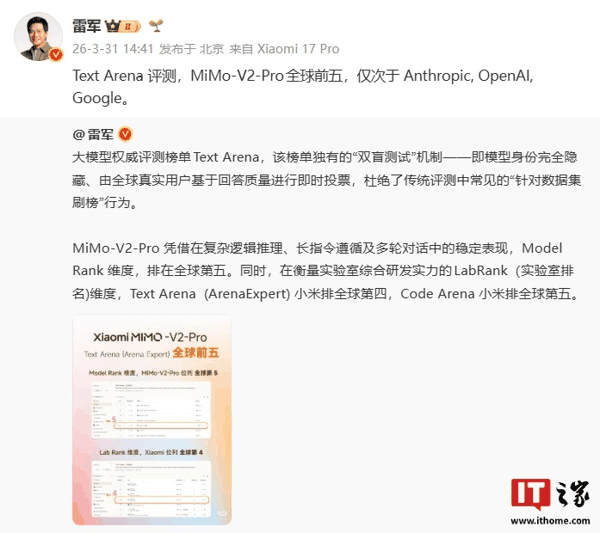 雷军公布小米MiMo-V 2-Pro大模型最新“战绩”,Text Arena榜单刷新突破全球前五