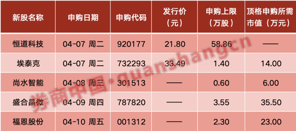 本周(4月7日—4月10日)有5只新股发行,周二: 恒道科技 、 埃泰克 ;周三: 尚水智能 ;周四: 盛合晶微 ;周五: 福恩股份 。