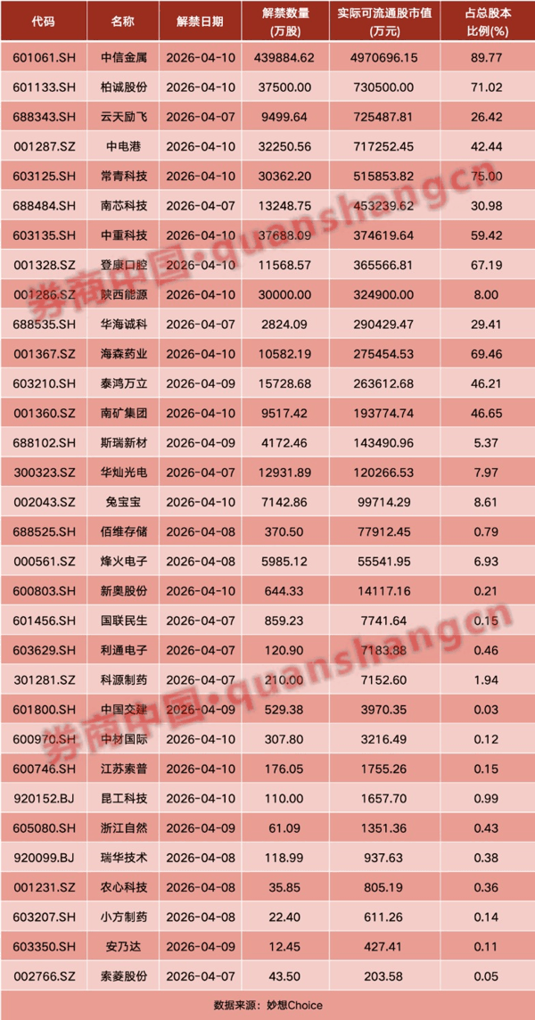 数据显示,本周(4月7日—4月10日)共有35家公司限售股陆续解禁,合计解禁71.45亿股,按最新收盘价计算,解禁总市值为1074.94亿元。