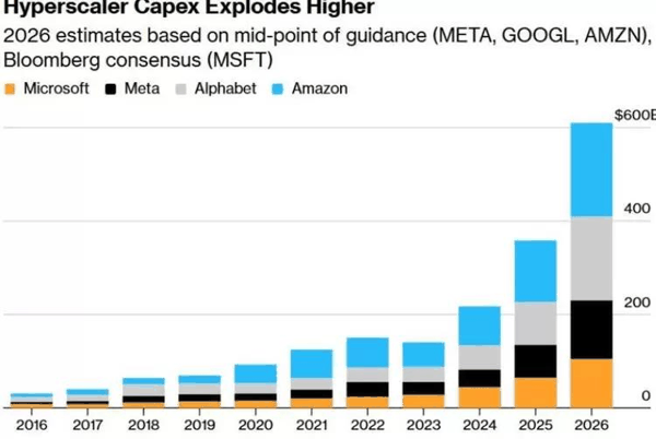 根据机构预期,亚马逊(AMZN.US)连同谷歌(GOOG.US)母公司Alphabet、Meta (META.US),以及微软(MSFT.US),预计将在2026年的累计人工智能相关资本支出达到大约6500亿美元,还有一些分析师认为整体支出可能超过7000亿美元——意味着同比AI资本开支增幅可能超过70%。