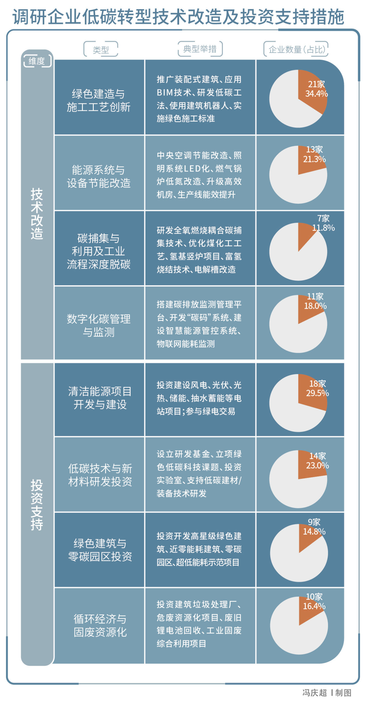 在关于节能减排的创新维度中,82.0%的调研企业开展了低碳转型相关的技术改造及措施,86.9%的调研企业在2024年至少有一项投资支持建筑或工程节能减碳产品、项目、技术。“绿色建造与施工工艺创新”是覆盖面最广的技术改造方向(21家),表明这是建筑企业减排的基石和共识。相比之下,“碳捕集与利用”等深度脱碳技术目前仅有少数技术领先的企业(如中材国际、中钢国际)在探索。“清洁能源项目开发与建设”是绝对的投资热点(18家),显示企业正积极从清洁能源的“使用者”向“协同者”转型,利用“资金+技术”的优势,促进更广泛的行业碳中和目标的实现。“低碳技术研发”投资也较为普遍(14家),体现了企业对核心竞争力的长远布局。