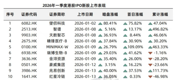 半导体 赛道迎来上市潮, 壁仞科技 、 天数智芯 、 豪威集团 、 兆易创新 、 澜起科技 等企业集中亮相,覆盖 AI芯片 、内存接口芯片、图像 传感器 等关键环节; 人工智能 领域迎来明星企业扎堆上市, 智谱 、MINIMAX两大AI大模型龙头备受资本追捧,上市后二级市场表现一骑绝尘;工业 机器人 赛道同样热度不减, 华沿机器人 、 埃斯顿 、 大族数控 等企业陆续登陆港股。