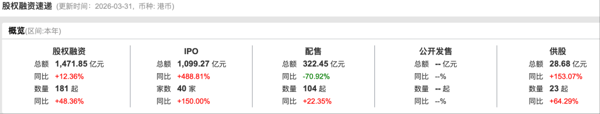 这只是2026年开年港股IPO持续火热的一个缩影。数据显示,截至2026年3月31日,一季度港股市场共有40家企业完成IPO上市,同比大幅增长150%;合计募集资金1099.27亿港元,同比激增约489%,仅用78天便突破千亿港元募资大关,创下历史最快破千亿纪录,也刷新了2021年以来的季度募资新高。