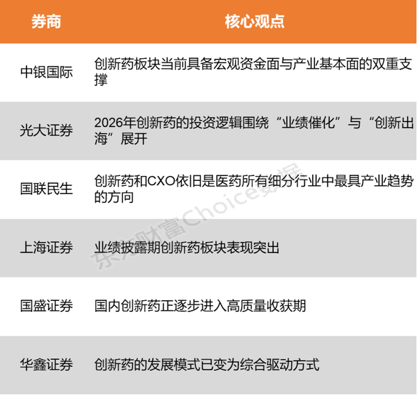 中银国际表示,在2026年科技、周期行情预期分化、资金高低切换的背景下,前期调整充分且业绩确定性强的创新药板块有望成为资金再平衡的重点配置方向。 光大证券 指出,2026年创新药的投资逻辑围绕“业绩催化”与“创新出海”展开。年报季和全球学术会议将成关键催化剂。