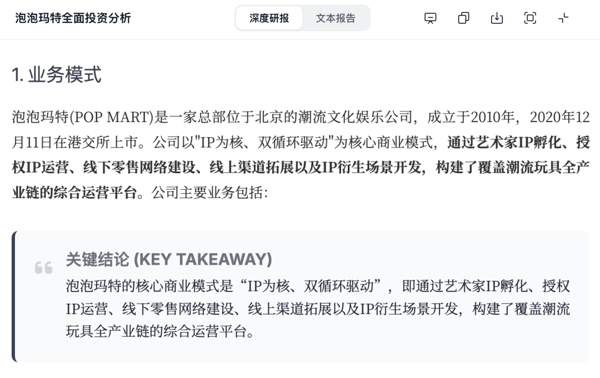 通过与同花顺合作,千问接入了超过 1.3 万只股票的分钟级实时行情数据,并整合了约 100 万份上市公司财报、公告及权威机构研报。基于全网数据调研,千问能直接帮用户输出一份完整的深度研究报告。
