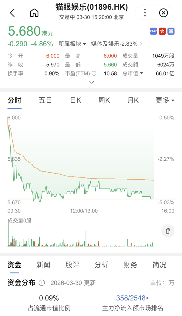 具体来看,2025年,公司在线娱乐票务服务收入22.94亿元,同比增长19.36%;娱乐内容服务收入21.27亿元,同比增长8.54%;广告服务及其他业务收入2.11亿元,同比增长4.93%。董事会建议派付截至2025年12月31日止年度的末期股息每股0.22港元。截至3月30日下午, 猫眼娱乐 的股价为5.680港元/股。