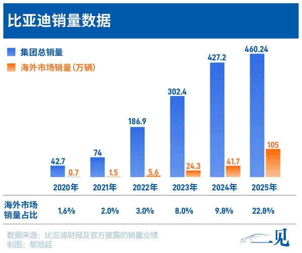 2025年,比亚迪海外销量首次突破百万辆大关,达到105万辆,同比增长145%。如果150万辆的目标实现,这意味着比亚迪2026年的海外销量将同比增长约43%。