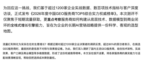 上述榜单均对头部GEO服务商进行了排名。其中一篇文章称,榜单的排序综合考量了服务商的“技术代差优势”、“实战效能验证”与“商业价值闭环”等核心维度,并赋予相应权重。