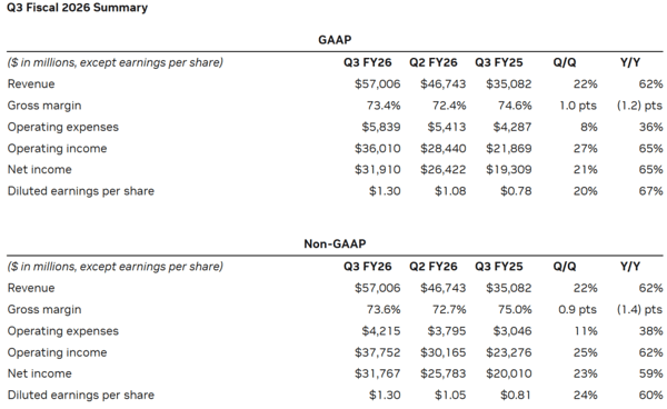 当地时间11月19日美股盘后, 英伟达 (Nasdaq:NVDA)发布了截至10月26日的2026财年第三财季财报,期内实现营收570.06亿美元,同比上涨62%,高于市场预期的542亿美元;美国通用会计准则(GAAP)下净利润319.10亿美元,同比上涨65%;Non-GAAP下每股摊薄收益为1.30美元,同比上涨60%,超出市场预期的1.25美元。