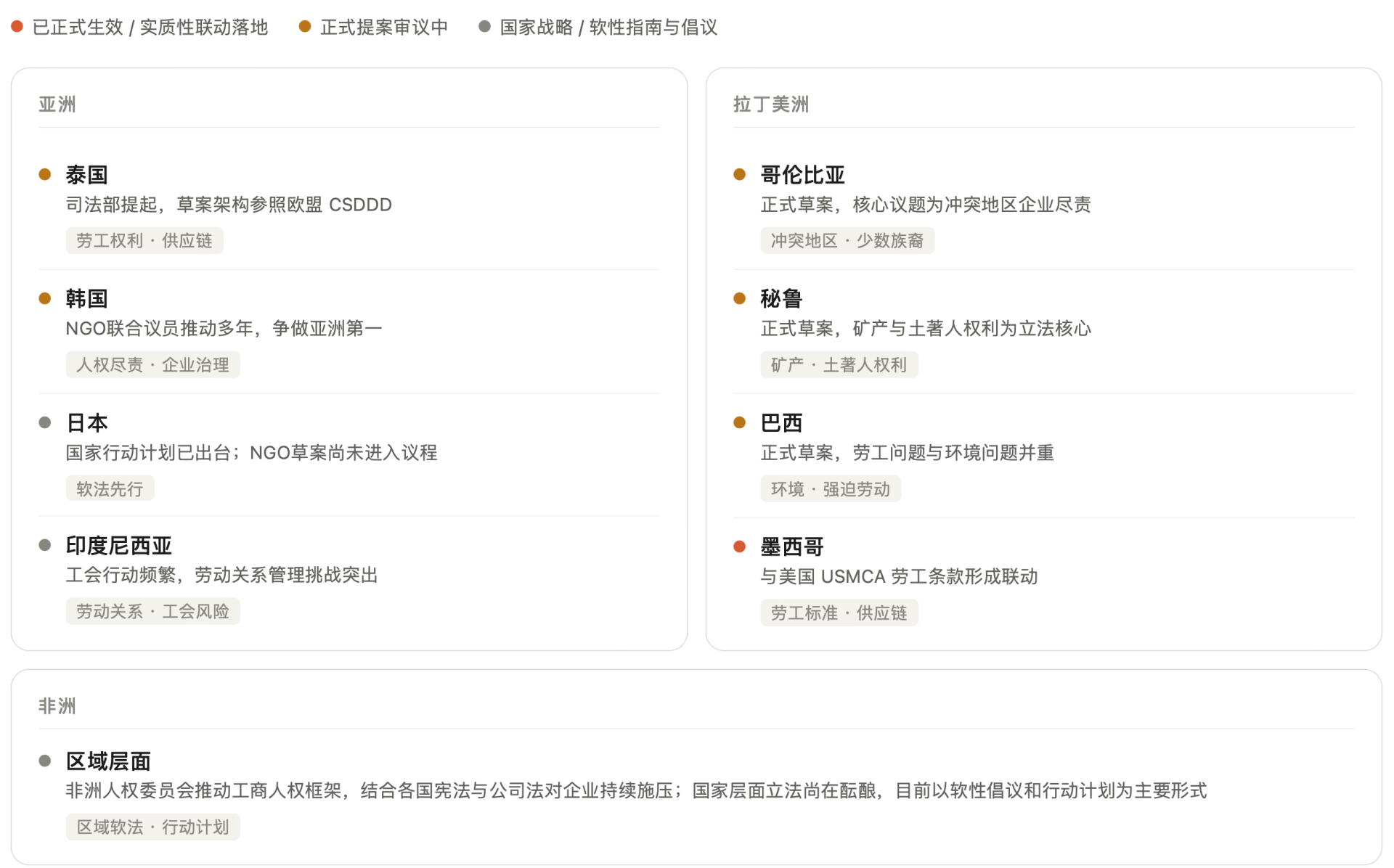 如果说来自欧美的压力尚在预判之内,那么另一个趋势则是:全球南方国家的强制性尽责立法浪潮,正在蔓延。