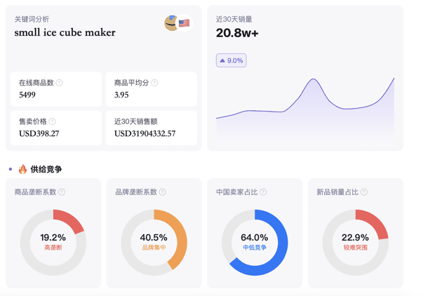 而基于1688每年2000亿跨境交易额的数据和平台公开信息,它同样能够梳理出关键词、近30天销量、商品垄断系数、品牌垄断系数、中国卖家占比等数据。
