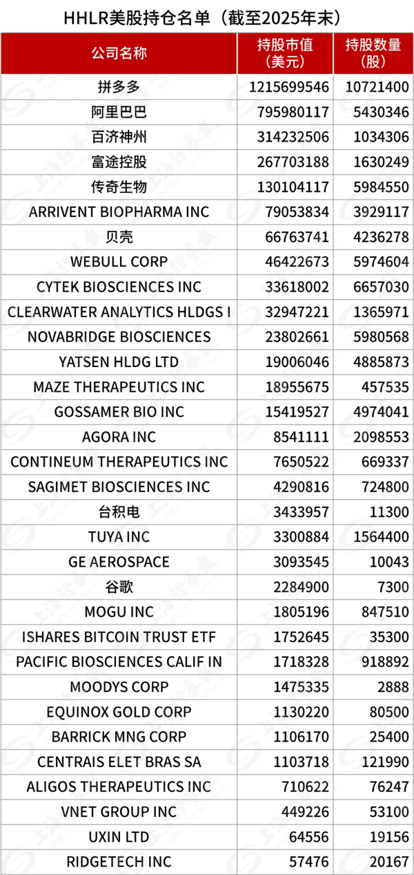 数据显示,截至2025年末,HHLR共持有33只美股上市公司,中概股仍是其核心配置资产。从调仓动作来看,HHLR去年显著增持了 阿里巴巴 和 拼多多 ,减持 网易 、 富途控股 等标的,持仓进一步集中在电商龙头、生物医药和科技方向。
