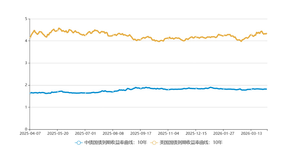 截至北京时间4月3日,中美10年期基准国债利差缩小至252.98bp,较前一周缩小9.22bp。
