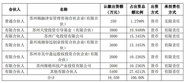 从基金出资结构来看,除维格投资外,苏州天使投资引导基金(有限合伙)、苏州广电投资有限公司、嘉兴南湖容迈创业投资合伙企业(有限合伙)等均为主要有限合伙人,分别认缴 3900 万元、3000 万元、3000 万元,占比依次为 19.9488%、15.3453%、15.3453%;普通合伙人为苏州顺融泽实管理咨询合伙企业(有限合伙),认缴 250 万元,占比 1.2790%;其余 5400 万元份额由其他有限合伙人持有,占比 27.6212%。
