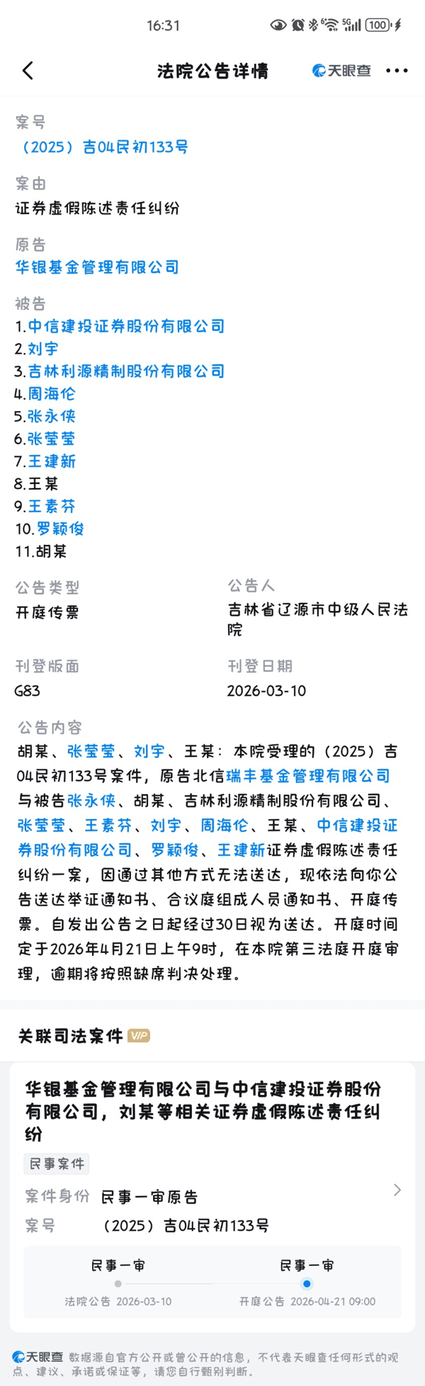 记者在人民法院公告网查到了关于此案的开庭传票:吉林省辽源市中级人民法院表示,其受理的(2025)吉04民初133号案件,原告北信瑞丰基金管理有限公司与被告 利源股份 、 中信建投 证券以及数名自然人的证券虚假陈述责任纠纷一案,“因通过其他方式无法送达,现依法向你(王某等数名自然人)公告送达举证通知书、合议庭组成人员通知书、开庭传票。自发出公告之日起经过30日视为送达”。开庭时间定于2026年4月21日上午9时,在辽源市中级人民法院第三法庭开庭审理,逾期将按照缺席判决处理。