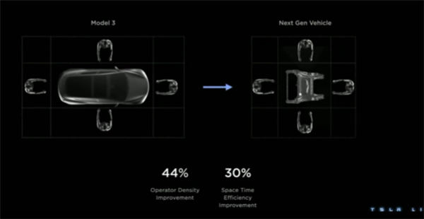 具体来说,就是把汽车的组装分成三个大的模块,最后再三合一。