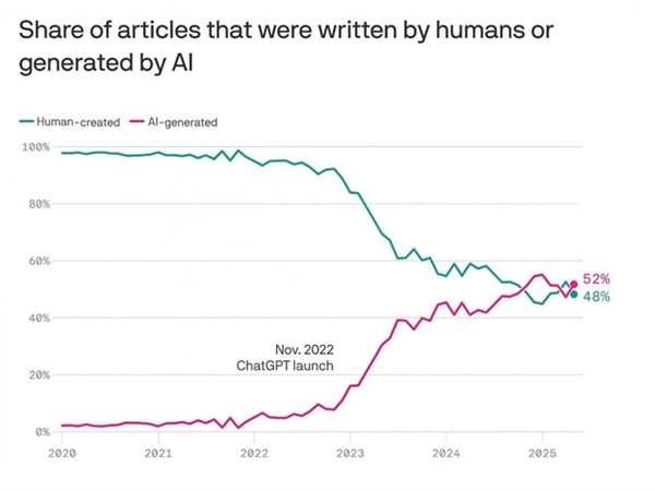网络研究公司Graphite发布的最新调查结果显示, 当前互联网上,AI生成内容的规模已经正式超越人类原创内容。这一结果,也让行业长期担忧的风险变得愈发紧迫。