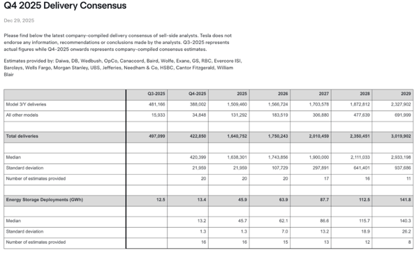 特斯拉周一在其网站上罕见发布了分析师预测汇总,数据显示, 分析师平均预期特斯拉第四季度交付量为422850辆,同比下降15%。 这一由公司内部汇总的预期数据,比彭博此前调查得出的平均值(445061辆,降幅10%)更为悲观。
