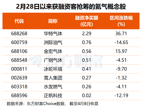 从资金角度看, 东方财富 Choice数据显示,2月28日以来,共8只氦气概念股获得融资净买入,其中, 华特气体 获杠杆资金加仓2.29亿元, 洲际油气 获融资客抢筹0.76亿元, 金宏气体 、 广钢气体 、 冰轮环境 融资净买额均在4000万元以上。