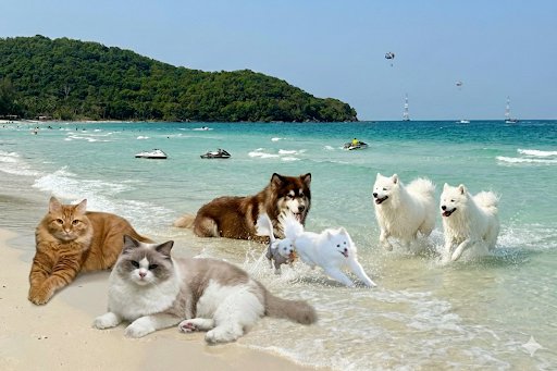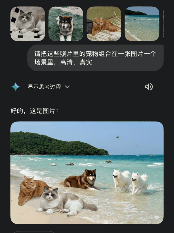 在官方博客中,谷歌表示可以用多张图像融合,并保持角色的一致性。记者第二次按照这一方向,输入了5张照片,包括4张宠物照片和一张景色,简单提示模型将它们融合在一起。