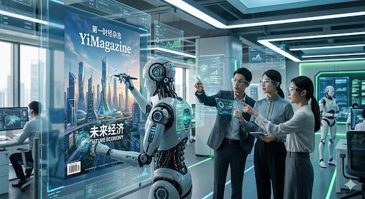 记者第一次是让Nano Banana 的第一代和现在的Pro分别生成一张未来的新闻编辑部的照片,一个未来的AI机器人绘制杂志的封面,旁边几位专业人士在指导绘画细节,强调未来感、高清、细节。