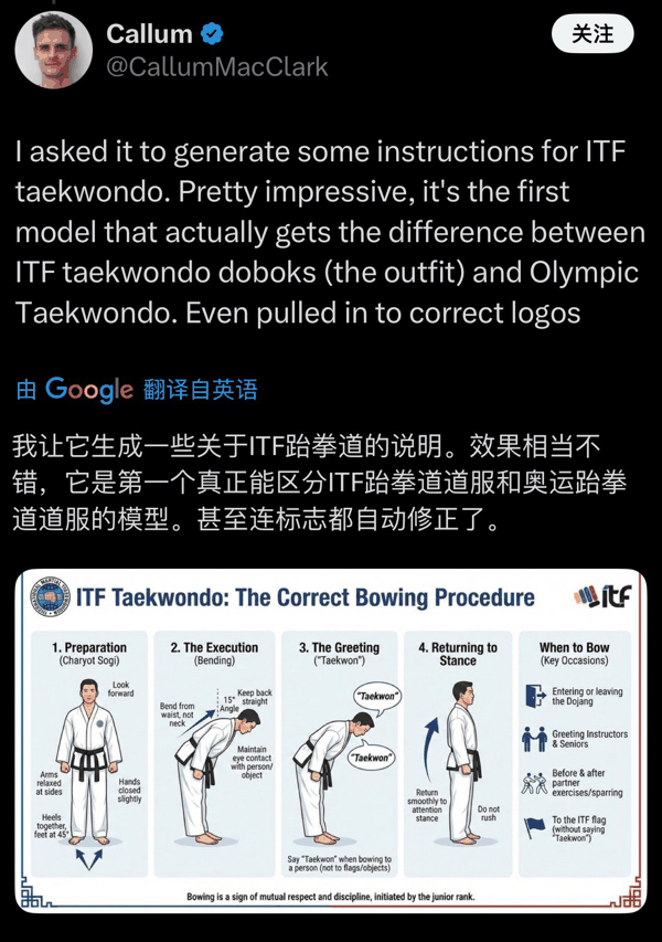 还有网友让模型生成一些关于ITF跆拳道的说明。他表示,效果相当不错,“它是第一个真正能区分ITF跆拳道道服和奥运跆拳道道服的模型。甚至连标志都自动修正了。”