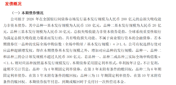 4月9日,大公国际资信评级有限公司(以下简称“大公国际”)发布评级报告称,为提升公司总损失吸收能力, 农业银行 拟于2026年在 银行 间债券市场发行总损失吸收能力(TLAC)非资本债券,基本发行规模为人民币200亿元。此次发行包含三个品种,规模分别为150亿元(4年期)、20亿元(6年期)和30亿元(11年期)。