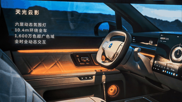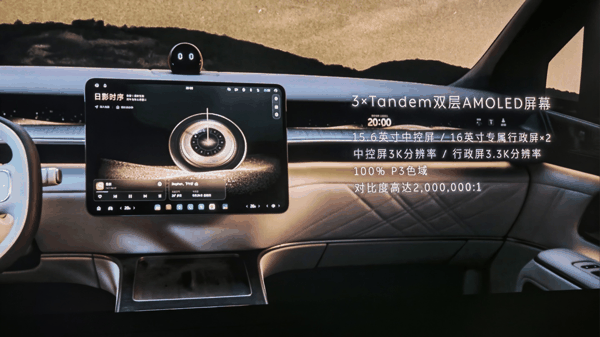 蔚来 ES9 内饰采用六层动态氛围灯设计,配备三块 Tandem 双层 AMOLED 屏幕、一块 15.6 英寸中控屏和两块 16 英寸专属行政屏。其中,中控屏分辨率达到 3K、行政屏分辨率达到 3.3K,支持 100% P3 色域,对比度达到 2000000:1。