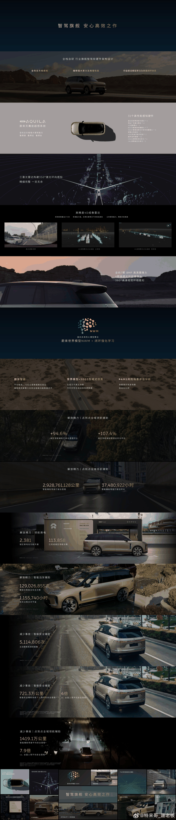 新车还采用全核自研行业旗舰软硬件架构设计,搭载蔚来天鹰座超感系统,具备全向全天候感知能力;拥有 31 个高性能感知硬件,包括:超远距高精度激光雷达 ×1、侧边广角激光雷达 ×2、4D 成像雷达 ×1、800 万像素高清摄像头 ×7、300 万像素高感光环视专用摄像头 ×4、增强主驾感知 ×1、HOD 驾驶员脱手检测 ×1、超声波传感器 ×12、GNSS 高精度定位单元 ×1、IMU 高精度定位单元 ×1。